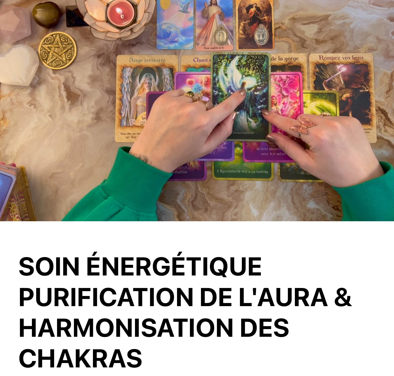 ATTENTION : Ce soin est avant tout un tirage de carte que j’ai créé qui peut vous permettre de purifier et d’améliorer votre énergie à travers tous les messages et les conseils donnés pendant le tirage. De plus, à travers ce tirage j’ai canalisé des énergies à haute vibration, afin d’amplifier la guérison de votre énergie. Donc, ne prenez pas ce soin énergétique comme un soin classique où l’on appose les mains sur une partie du corps à guérir.