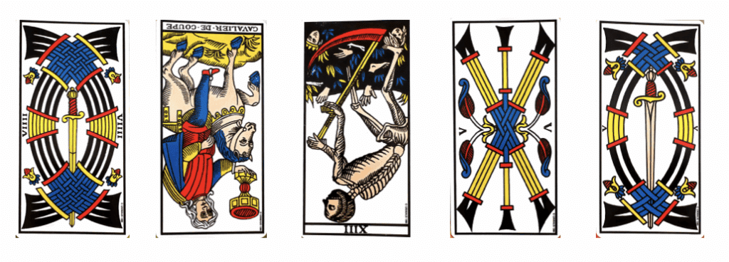 Vision d’ensemble – L’émotion ici la plus difficile à accueillir est selon moi la tristesse et le chagrin en lien avec la récurrence de la couleur noire qui ressort dans l’ensemble. Difficulté à gérer la perte et le sentiment d’abandon. Ne pas laisser la tristesse ressortir et pleurer librement. Ne pas oser penser négativement ou voir la situation négativement, ce qui bloque le besoin émotionnel de s’exprimer. De plus la 5 d’épées et la 5 de bâtons peut nous montrer une personne combative qui est plutôt dans l’action et le mental au lieu d’accueillir les émotions et le potentiel mal être du moment. Cela est accentué par le cavalier de coupe à l’envers, l’expression des sentiments et émotions peut être même bloqué actuellement et tout reste coincé dans l’inconscient (la neuf d’épées). La mort à l’envers au centre du tirage peut nous montrer qu’il peut y avoir même des symptômes corporels (car la couleur beige très présente sur cette carte dans le tarot représente le corps humain et l’expérience humaine) liées au blocage émotionnel et même une répétition de schémas avec une accumulation de toxines dans le corps et de toxicité dans la vie car difficulté à purger et purifier la tristesse…